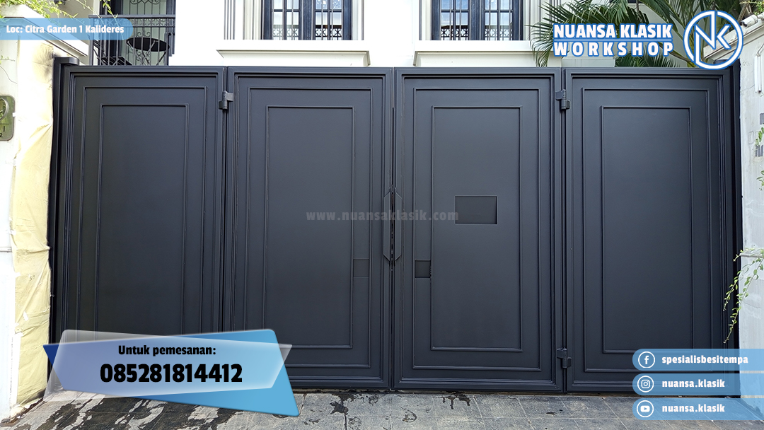 Pagar besi tempa dan railing balkon KronjoProject pembuatan dan pemasangan pagar besi tempa dan railing balkon Kronjo, Kab. Tangerang. Pagar minimalis full plat TomangPagar besi minimalis menggunakan full plat kombinasi plat tekuk dan plat perforated. Pagar besi model lipat Citra Garden 1 Kalideres, Jakarta Barat Railing balkon Perum Mega Persada Residence Pondok Aren Tangerang Selatan Project railing tangga layang dan railing balkon besi tempa Balaraja Kb. Tangerang Project pagar klasik Pondok Indah Metro Alam X Project pagar besi tempa klasik Ciganjur Project Railing tangga dan balkon Taman Mahkota Rawa Bokor - Tangerang Project pagar dan railing balkon besi tempa Komplek BAPPENAS Pejaten Barat Project pagar besi tempa Sumur Bor - Cengkareng Barat Project pagar besi tempa Banjarmasin Kalimantan Selatan